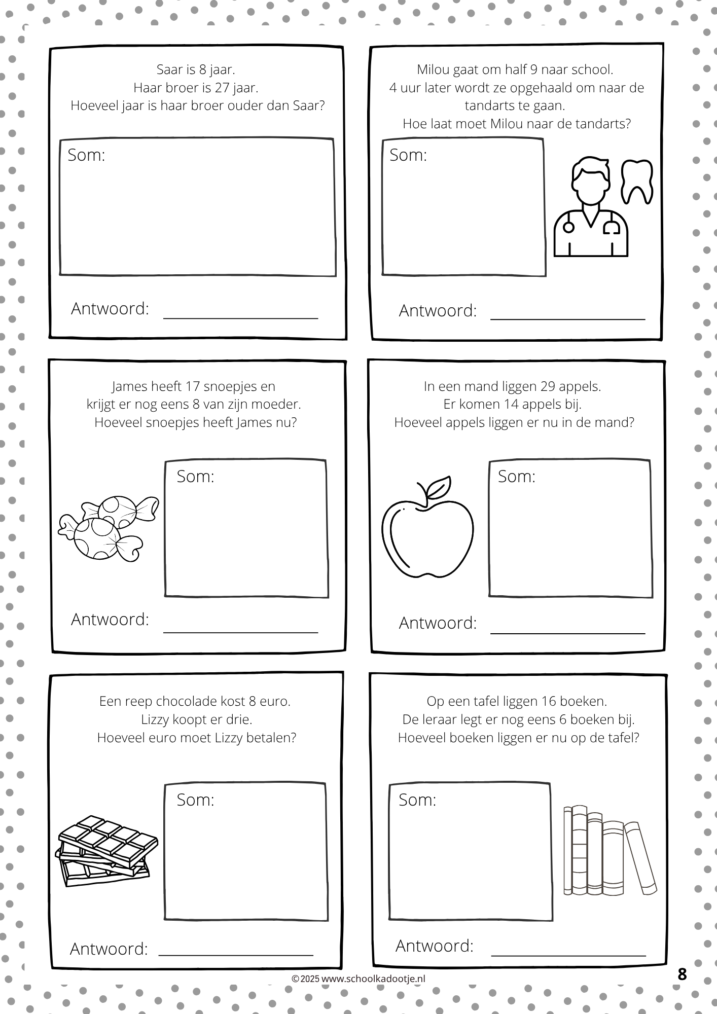 Dit is het werkboekje (download) om verhaaltjessommen te oefenen. Fijn oefenmateriaal waarbij kinderen gaan nadenken over de som en daarna pas het antwoord noteren. De som kan genoteerd worden in het lege vakje. Ook kunnen de kinderen hier bijvoorbeeld een getallenlijn etc. in tekenen om tot een antwoord te komen.