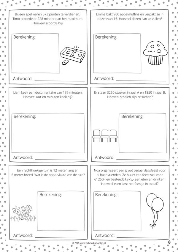 Dit download staat vol rekenopgaven, speciaal samengesteld voor kinderen uit groep 7. Het helpt leerlingen om stap voor stap te oefenen met begrijpend rekenen. Ze lezen eerst de situatie, denken goed na over de som, en noteren daarna pas hun antwoord. In het lege vak kunnen ze hun berekening opschrijven of bijvoorbeeld een schema of getallenlijn tekenen om tot het juiste antwoord te komen.